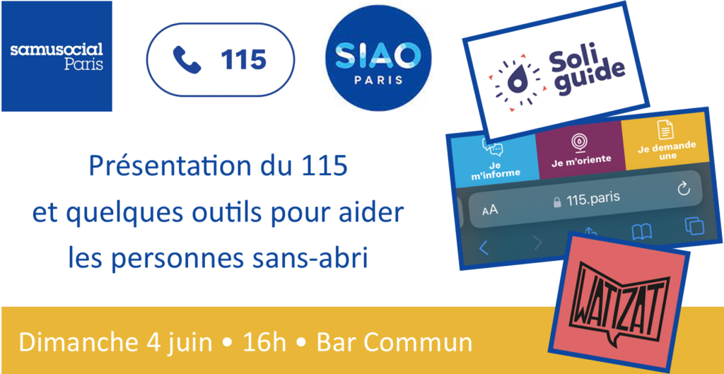 Le 115 est un numéro d’urgence national, géré sur Paris par le Samusocial de Paris. Il est ouvert 24h/24, 7 jours/7. Un service de traduction simultané lui permet de répondre dans toutes les langues. Les écoutants sociaux évaluent les besoins des appelants, les informent des dispositifs à leur disposition, et les orientent vers des solutions d’hébergement en fonction des places disponibles. Il s’agit d’hébergement de courte durée avec des disponibilités très limitées. Les outils qui permettent de trouver les bonnes adresses (où manger, se soigner, trouver un travailleur social, etc.) sont en réalité à disposition de tous! Il s’agit notamment du Soliguide et du Watizat.
