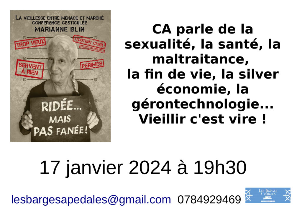 C’est à partir de ressentis, d’anecdotes personnelles, de l’humour, de l’émotion, des lectures pleines de sens, de l’interpellation du public, que la conférencière aborde des idées reçues concernant les « vieux », sur la sexualité, la santé, la maltraitance, la fin de vie, la silver économie, la gérontechnologie…