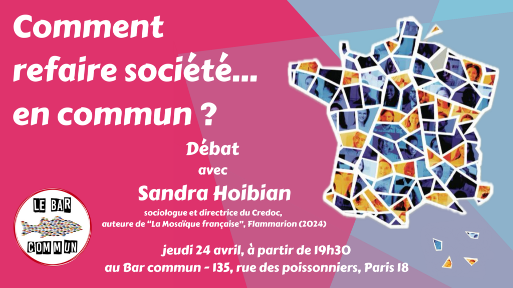 Selon elle, le principal défi que doit relever notre vivre ensemble est l’esprit de compétition qui a infusé toute notre société. Et pour relever ce défi elle propose quelques pistes pour refaire société autour des communs et ça tombe bien c’est l’objet du Bar commun !