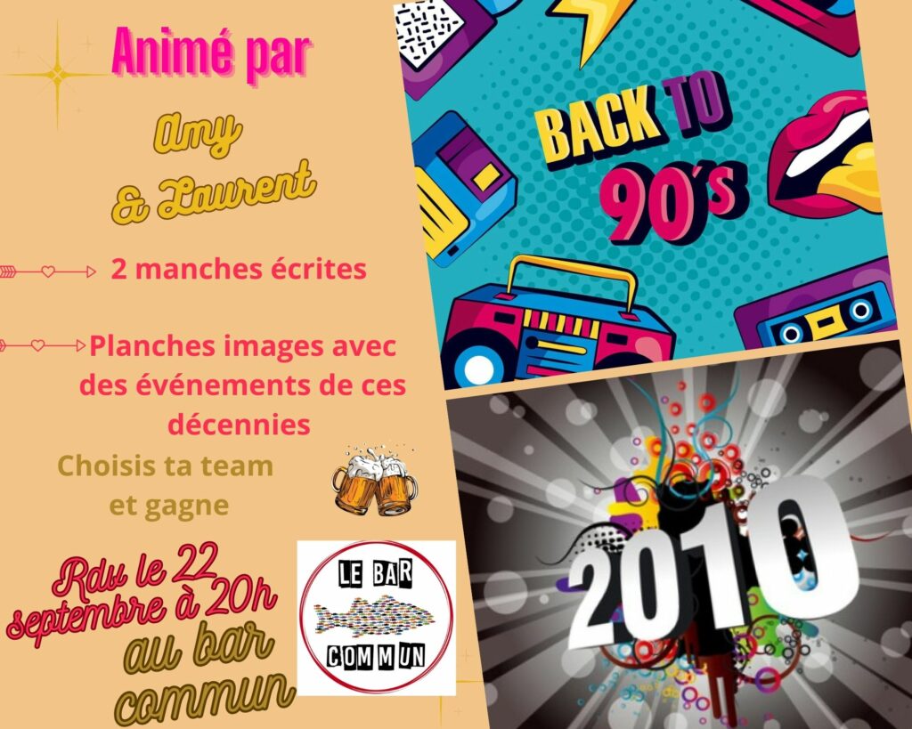 Viens seul(e) ou en groupe à cette soirée blind test 90/2010 en 2 manches avec une planche image d’évènements de ces décennies. Rendez-vous au bar commun pour tenter de gagner.