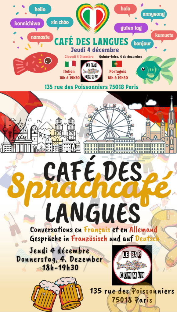 Qu’importe votre niveau, nous vous attendons au Café des langues du Bar Commun le jeudi 4 décembre de 18h à 19h30.