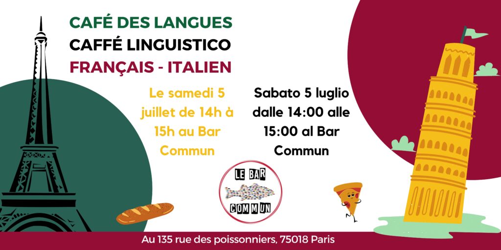 Avremo il nostro primo caffè in italiano e in francese, VO! Incontriamoci sabato 5 luglio, dalle 14:00 alle 15:00, al Bar Commun. Che siate principianti o italiani in VO livello Truffaut, venite a praticare in un’atmosfera rilassata e accogliente. Davanti a un caffè o a una birra, scambiamoci in italiano su temi della vita quotidiana. Miglioriamo insieme divertendoci e facendo nuove conoscenze. Vi aspettiamo numerose e numerosi per questa prima!