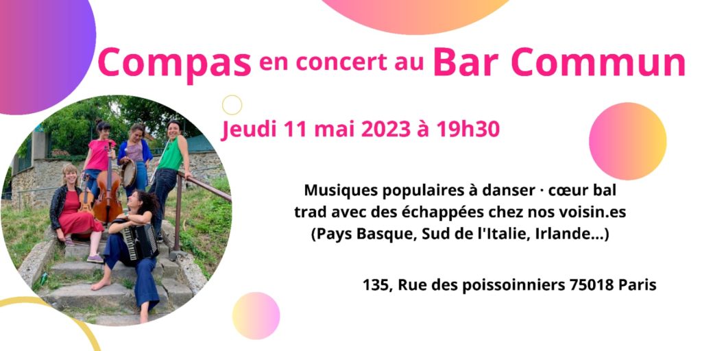 Nous sommes Compás, compañeras, amies, camarades…. Nous aimons faire de la musique ensemble, jouer, chanter, créer un espace de fête et de rencontre là où nous passons. Nous jouons un répertoire de musiques populaires à danser d’ici (scottish, mazurka, bourrée, valse etc) et d’ailleurs (Pays Basque, Sud de l’Italie, Irlande..).