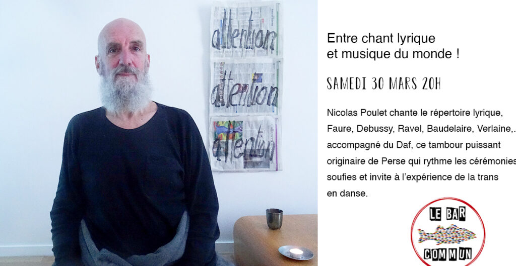 Nicolas Poulet chante le répertoire lyrique : Faure, Debussy, Ravel, Baudelaire, Verlaine… accompagné du Daf, ce tambour puissant originaire de Perse qui rythme les cérémonies soufies et invite à l’expérience de trans en danse.