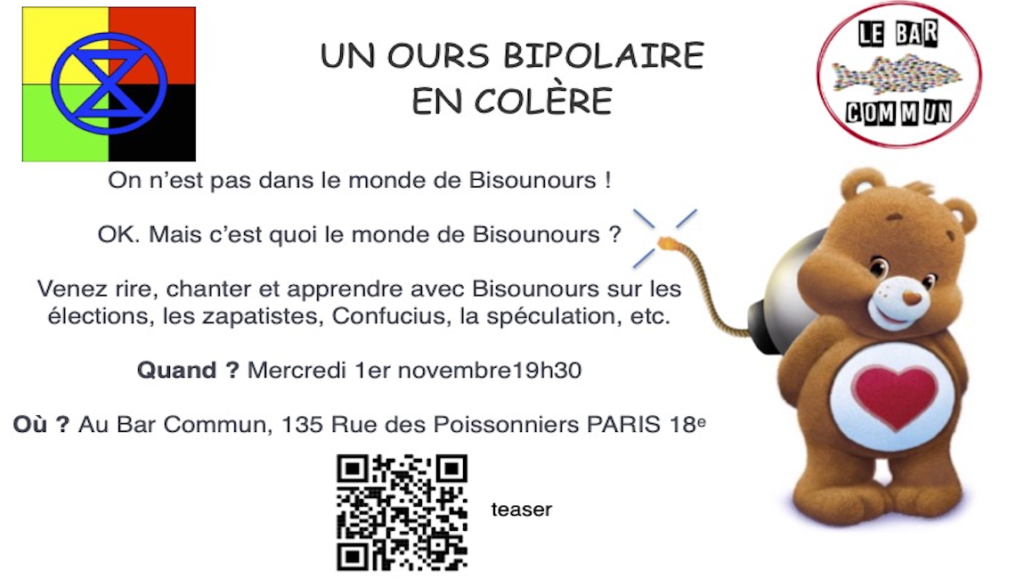 Prenez un utopiste, mettez-lui le nez dans le dérèglement climatique, puis trempez-le dans Extinction Rébellion, la décroissance, les gilets jaunes et les zapatistes. Vous obtenez un ours bipolaire en colère capable de vous refaire le monde en une heure à peu près.