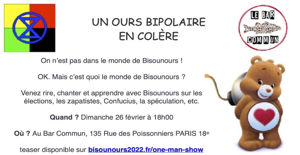 Prenez un utopiste, mettez-lui le nez dans le dérèglement climatique puis trempez-le dans Extinction Rébellion, dans la décroissance, dans les gilets jaunes et dans les zapatistes. Vous obtenez un ours bipolaire en colère capable de vous refaire le monde en moins d’une heure. Éteignez la télé et laissez Bisounours vous réveiller pour vous faire rêver d’un nouveau monde. C’est le one-man-show pour la vie contre l’argent.