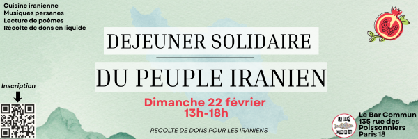 Nous vous donnons rendez-vous le dimanche 22 février à partir de 13h, au Bar Commun, autour d’un buffet aux saveurs persanes. Nous partagerons un moment chaleureux à l’image de notre culture, entre musique iranienne, chants et lectures de poèmes.