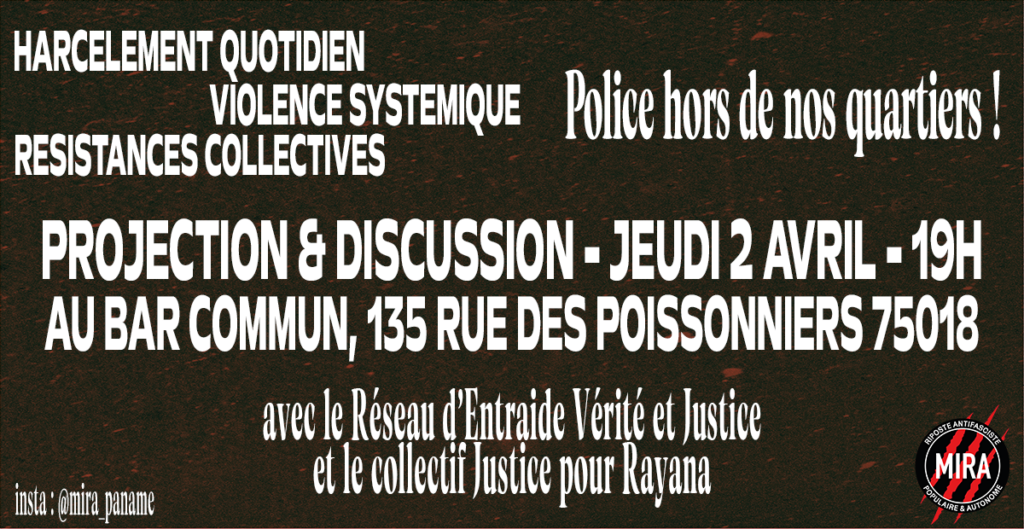 Projection et table ronde, avec le Réseau d’Entraide Vérité et Justice et le collectif Justice pour Rayana.