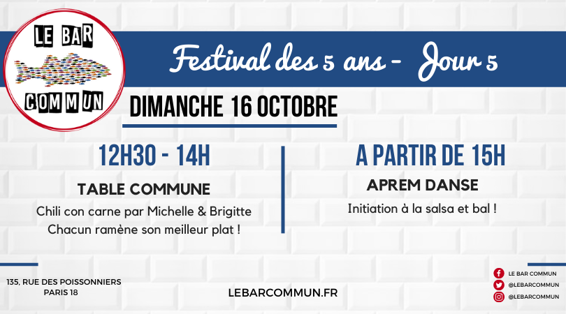 Ce dimanche 16 octobre, on vous attend donc nombreux pour souffler nos 5 bougies autour d’un repas partagé. Nous aurons le plaisir de déguster un délicieux chili con carne concocté par Michelle et Brigitte.