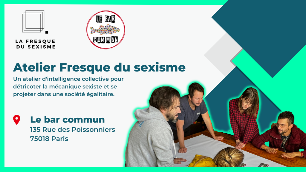 ► Une expérience ludique et collaborative visant à décortiquer le système sexiste dans le but de contribuer à une société plus égalitaire. Comment ? Par la pédagogie puis la mise en action. Inspiré du génie pédagogique de La Fresque du Climat, cet atelier permet de mieux comprendre les rouages du système sexiste actuel à l’aide de cartes. À travers une approche synthétique et un déroulement collaboratif, une équipe de 4 à 8 personnes suit les 3 phases de l’atelier suivantes :