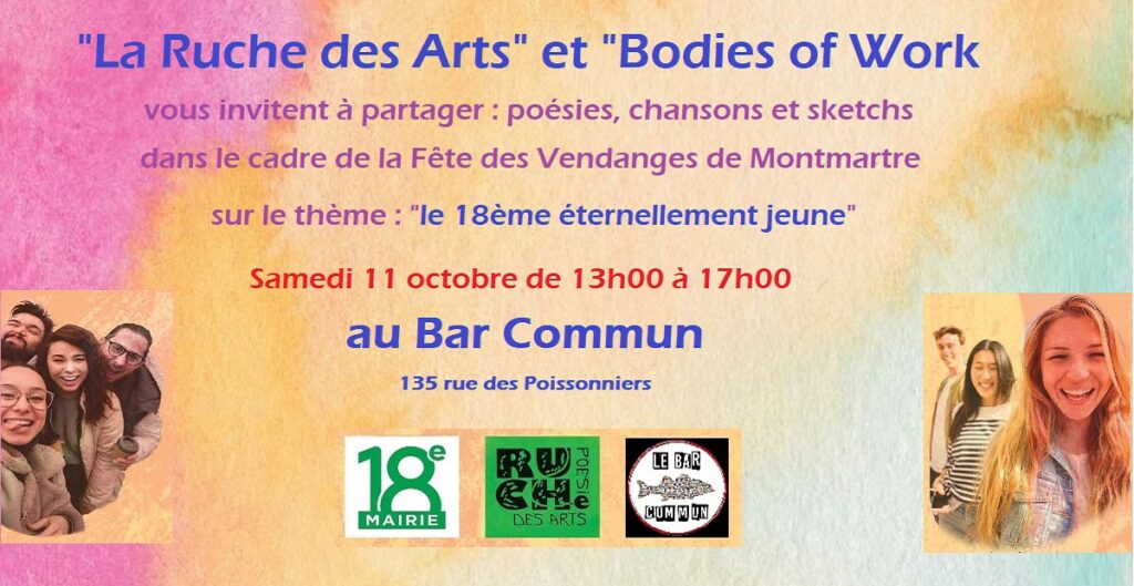 2 associations locales du 18ème organisatrices de l’événement, « La Ruche des Arts »- association locale de poètes, chanteurs et artistes français et « Bodies of Work » – association locale bilingue dont le but est la promotion de la littérature et les arts de la scène en anglais et en français.