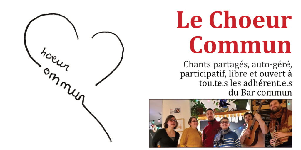 Chacun propose les chants qu’il veut partager dans notre chorale autogérée et participative ! Que de la bonne humeur et du plaisir. Un vrai moment de détente. Pas de niveau exigé, pas de chef de chœur. Libre et ouvert à tou.te.s les adhérent.e.s du Bar commun.