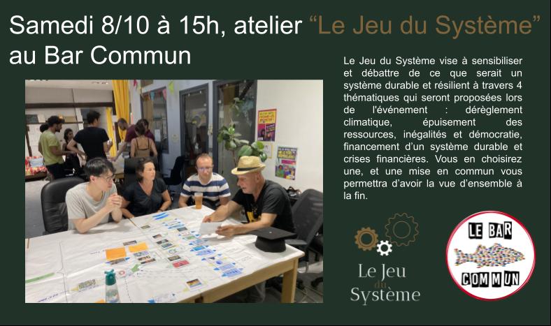 Le Jeu du Système sera proposé le samedi 8/10 au Bar Commun de 15h à 18h. Cet atelier ludique vise à sensibiliser et débattre de ce que serait un système durable et résilient à travers 4 thématiques qui seront proposées lors de l’événement : dérèglement climatique, épuisement des ressources, inégalités et démocratie, financement d’un système durable et crises financières. Vous en choisirez une, et une mise en commun vous permettra d’avoir la vue d’ensemble à la fin.