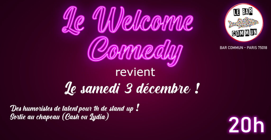 Ce samedi 3 décembre, le Welcome Comedy revient se produire sur la scène du Bar Commun.Venez soutenir et applaudir Alev Önel, Adrien Arnoux, Amélie Coispel, Romain Harel, et bien d’autres encore.Nous vous attendons nombreux.ses pour ce bel événement humoristique!