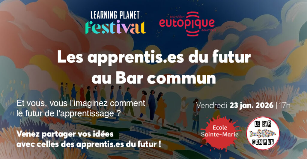 Le 23 janvier, ce sont les apprentis.es du futur de l’école Sainte-Marie dans le 18e à Paris qui prennent la parole au Bar commun, durant le Festival de l’Apprendre. À travers un atelier participatif animé par Eutopique, ils partagent leurs idées, leurs visions et leurs questions sur la manière dont on apprendra demain. Ensemble, ils donnent forme à leurs imaginaires en créant des objets, maquettes, dessins, vidéos ou récits, pour explorer les futurs possibles de l’école et de l’apprentissage dans 20 ou 30 ans. Cet atelier ludique et collaboratif valorise l’intelligence collective, la créativité et le dialogue, en faisant des enfants de véritables auteurs et acteurs du futur de l’éducation. Leurs créations seront également partagées lors d’une rencontre avec l’UNESCO en février.