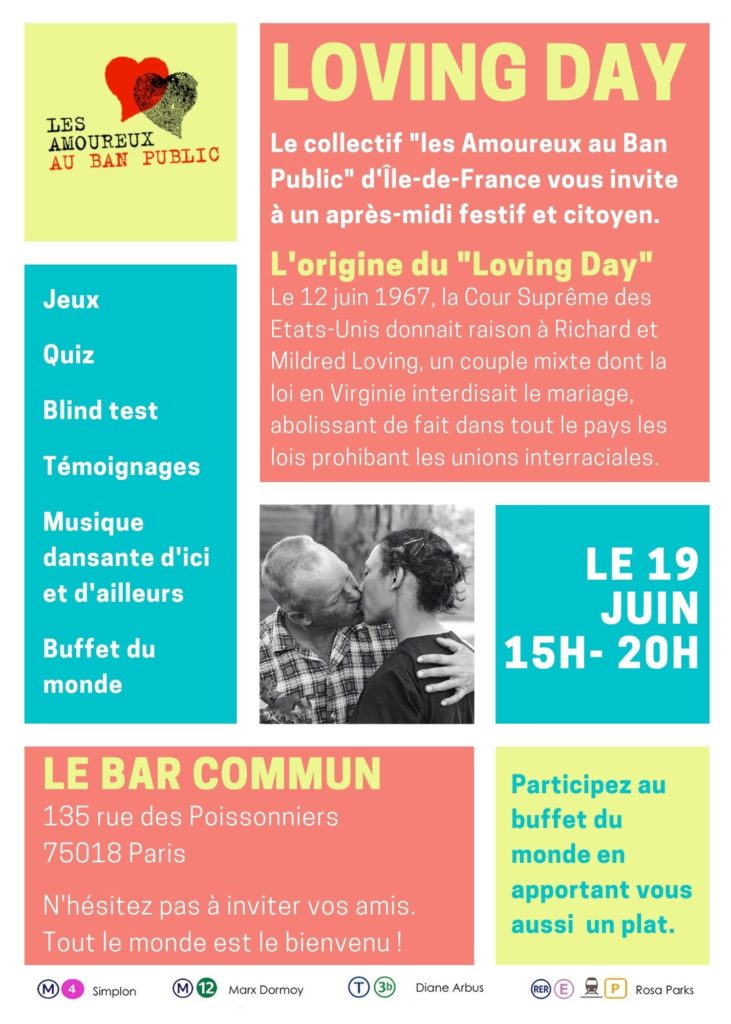 Les Amoureux au ban public est une association, issue de la Cimade, qui se bat depuis 2007 pour le droit des couples binationaux à s’aimer et à fonder une famille en France. Pour honorer nos combats et nos amours, nous vous convions le dimanche 19 juin de 15h à 20h à un Loving Day, après-midi de fête et de luttes agrémenté de musique, de témoignages, de jeux et d’une dégustation de plats du monde entier