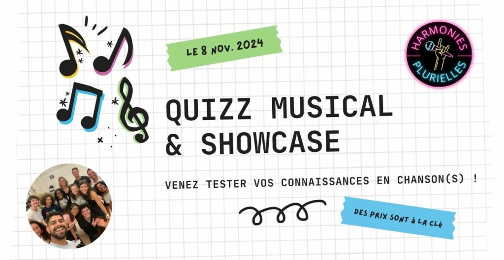 Nous vous invitons à une soirée musicale exceptionnelle avec Harmonies Plurielles, notre troupe de comédie musicale amateur. Participez à notre Quiz Musical & Showcase pour soutenir notre projet de spectacle, et vivez une expérience unique !