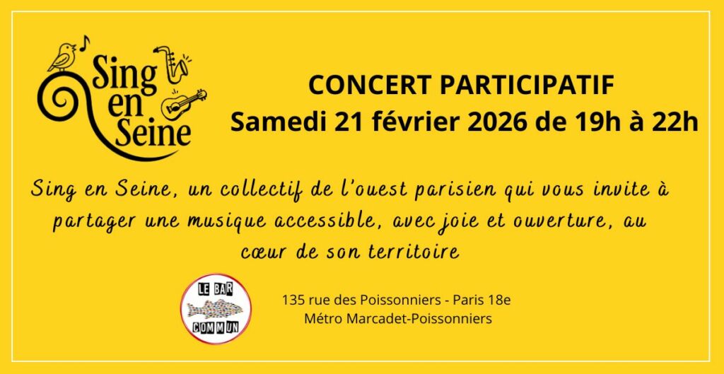 Avec des potes musiciens et chanteurs, nous avons monté notre collectif Sing En Seine en avril 2025. Nos valeurs sont le partage, la joie, la simplicité et l’envie d’œuvrer pour un monde meilleur !