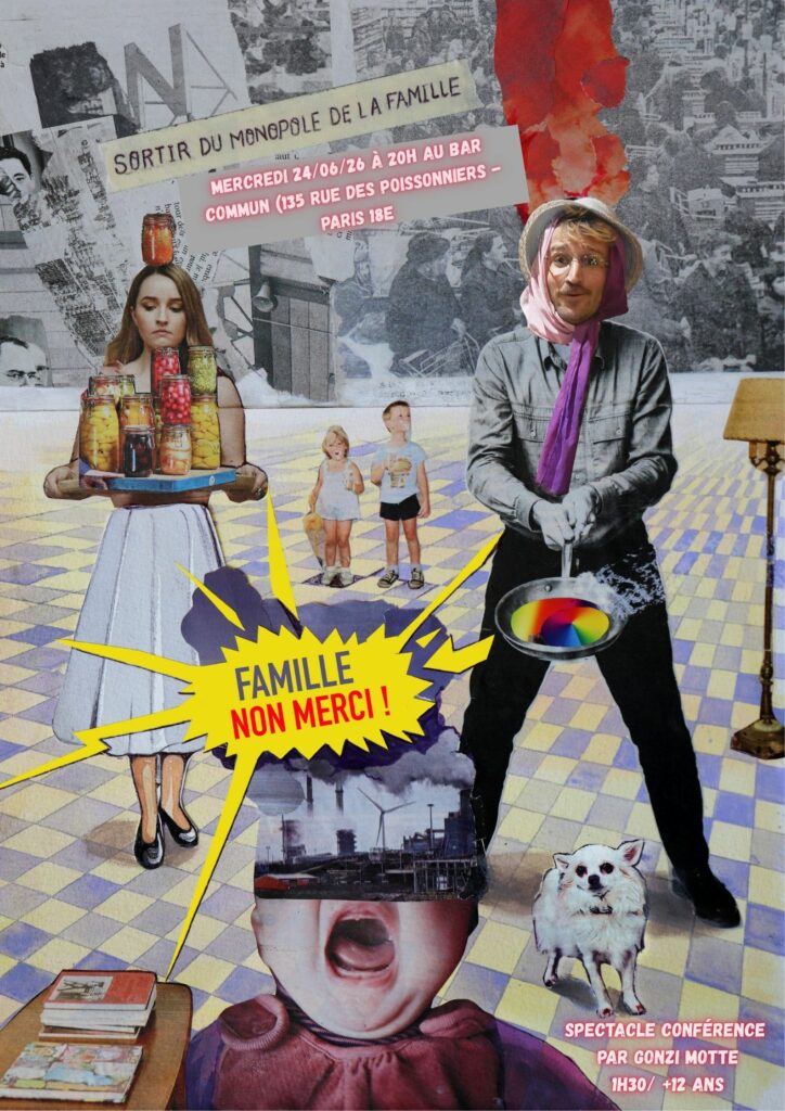 Gonzi nous raconte son rapport à la famille. Issu d’une famille bourgeoise du Nord de la France, il nous relate avec humour son enfance et son « mérite » pour grimper en haut de la marche, à moins qu’il n’était déjà en haut de l’échelle sociale ? Ses conflits avec l’hétéronormativité vont l’amener à la rupture pour déconstruire le mythe dominant de la famille nucléaire et de sa reproduction de classe.