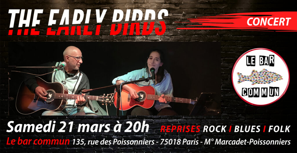 The Early Birds est né de la rencontre de musiciens de la scène Rock / Blues. Par leur réinterprétation de morceaux au départ composés pour des groupes électriques, The Early Birds racontent de manière plus intime et immédiatement accessible les grands moments du Country, du Blues et du Rock de ces dernières décennies. Le répertoire des Early Birds est comme une playlist intemporelle, rappelant à chacun les musiques qui ont façonné leur culture musicale.